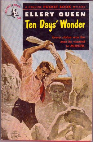 Ten Days Wonder 4The tale: Before WWII, Ellery met expat sculptor Howard van Horn in Paris, and has kept more or less in touch with him since, although he has never learned that Howard hails from Wrightsville. Howard’s home household consists of his adoptive father (Diedrich), step-mother Sally (also “adopted “ by the father at a young age), Diedrich’s demonic brother Wolfert, and their mother, who lives separately and wanders the grounds. Howard and Sally have an affair, and are blackmailed. Shenanigans ensue.